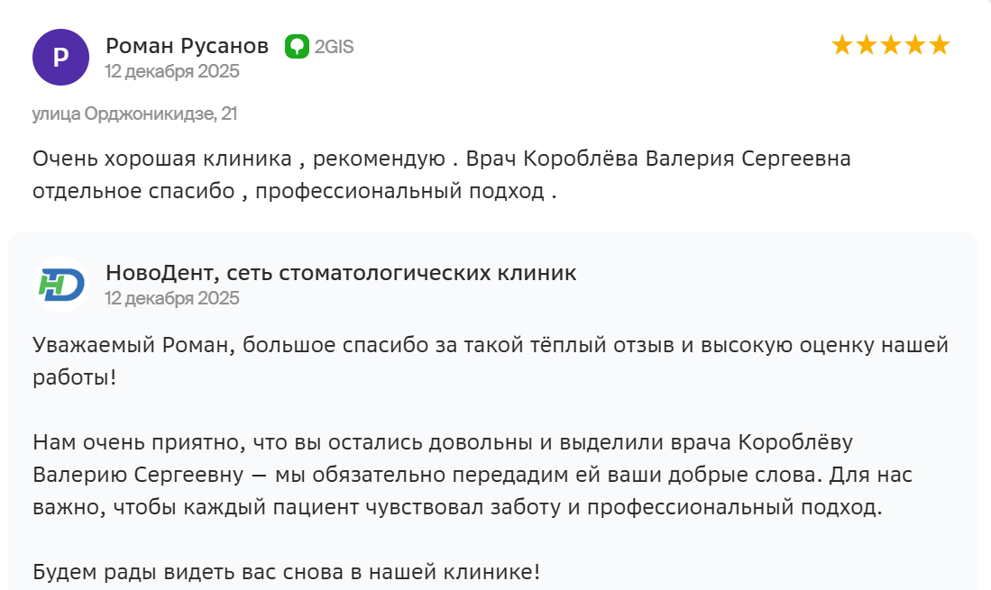 Посетила стоматологическую клинику «Новодент» и осталась очень довольна. Вежливый и профессиональный персонал сразу создал комфортную атмосферу. Врач Ванькова А.А. подробно объяснила все этапы лечения, во время лечения все этапы проговаривала и спрашивала комфортно ли мне и как я себя чувствую. Очень трепетно и бережно относилась что помогло избавиться от страха. Современное оборудование и чистота кабинетов внушают доверие. Рекомендую всем, кто ищет качественную стоматологическую помощь!