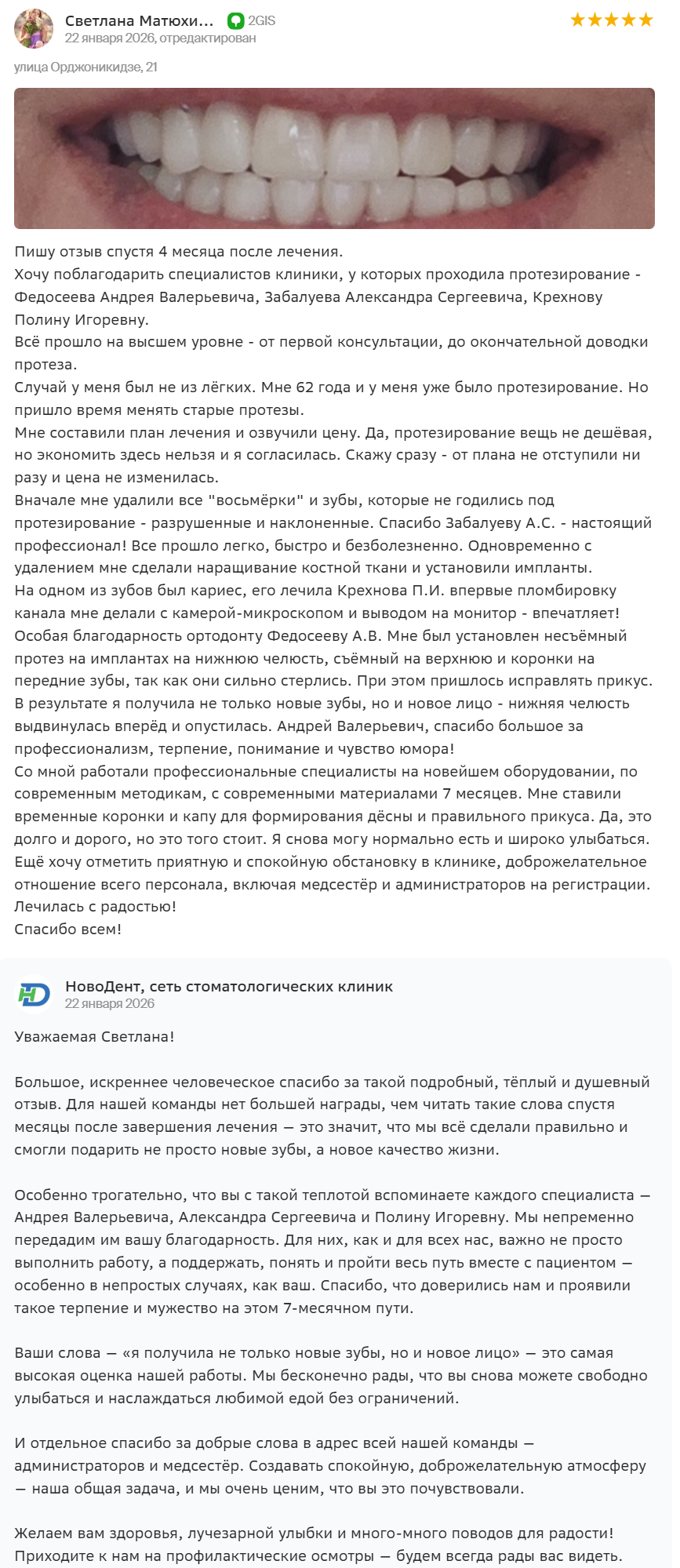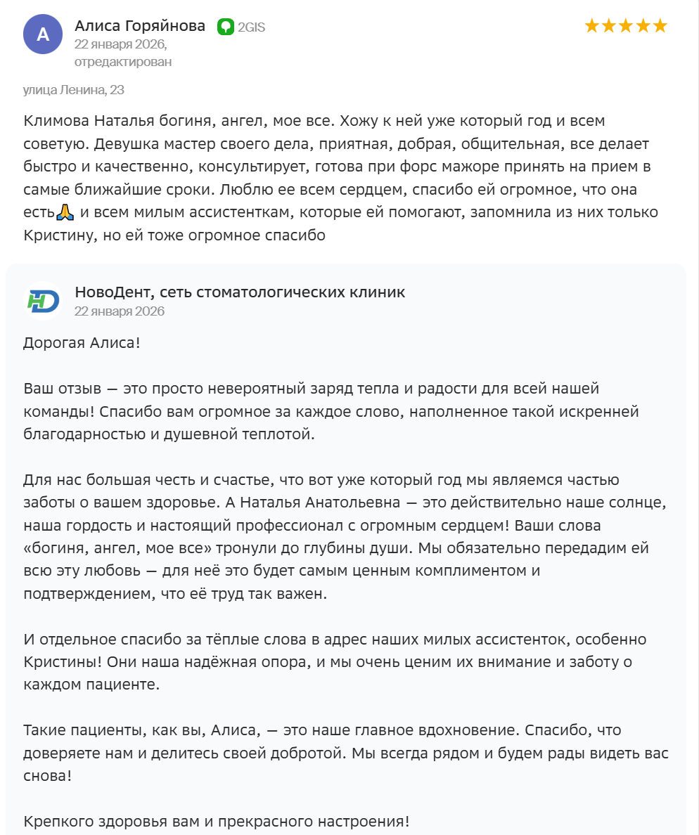 О клинике Новодент впечатления только самые хорошие. Хочу выразить огромную благодарность врачу Ваньковой Александре Андреевне! Спасибо за Вашу доброту и высочайший профессионализм! Читать отзыв полностью