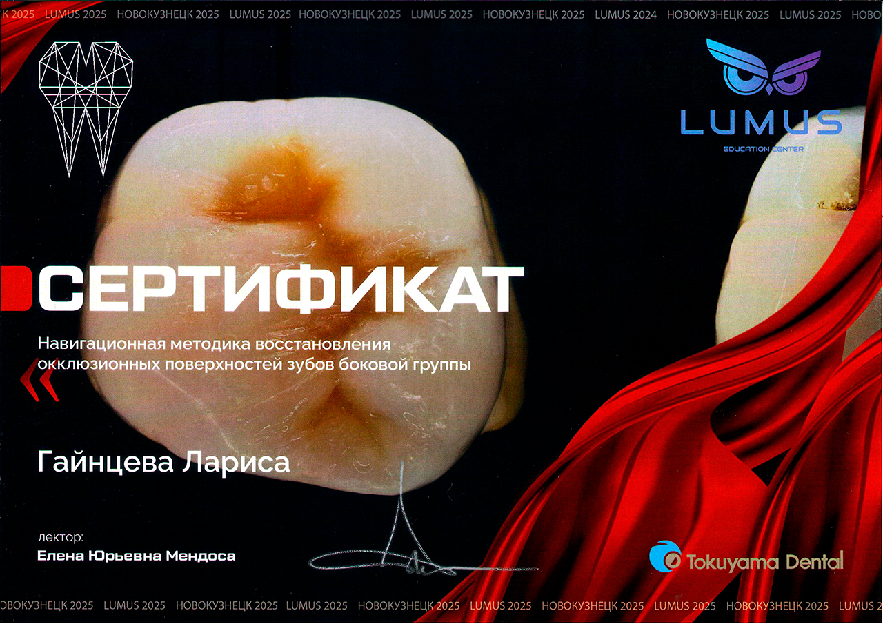 - 2025 г. — обучилась на курсе «Навигационная методика восстановления окклюзионных поверхностей зубов боковой группы».